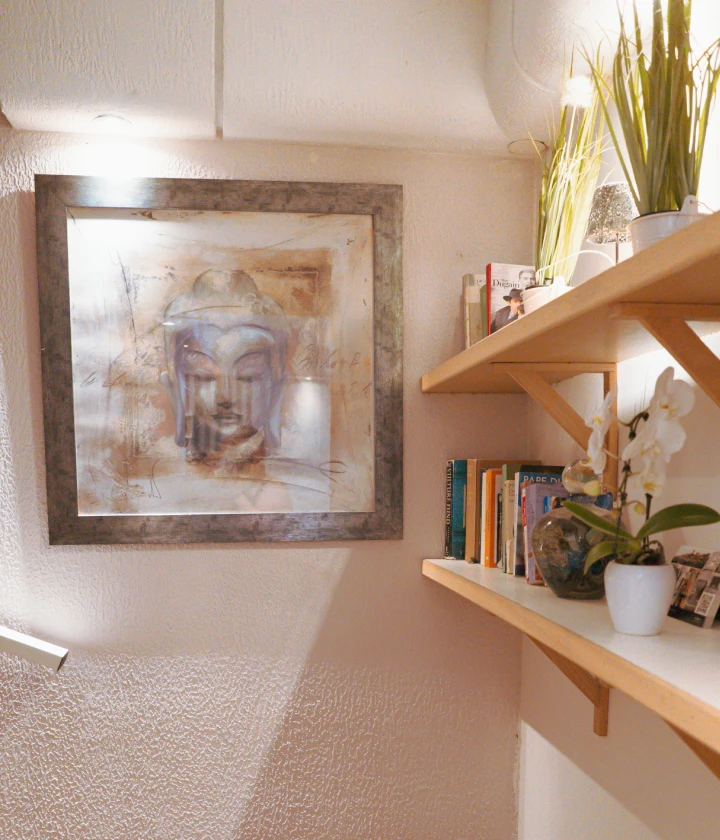 Peinture encadrée, étagère avec des livres et une plante dans une pièce éclairée.