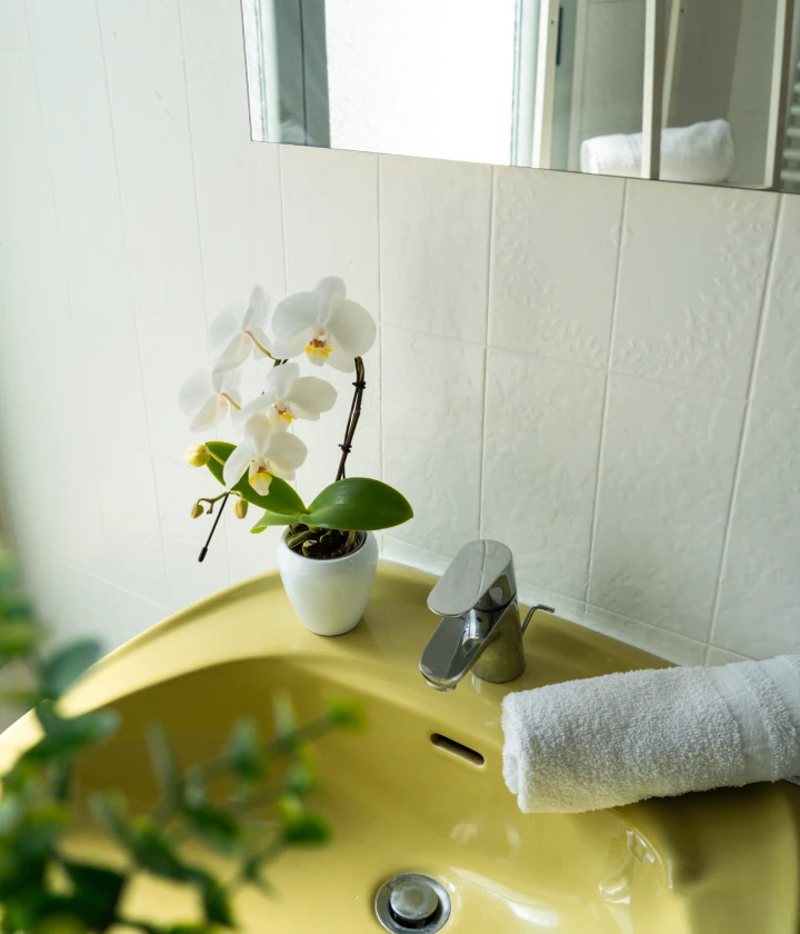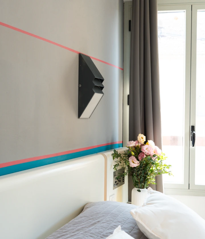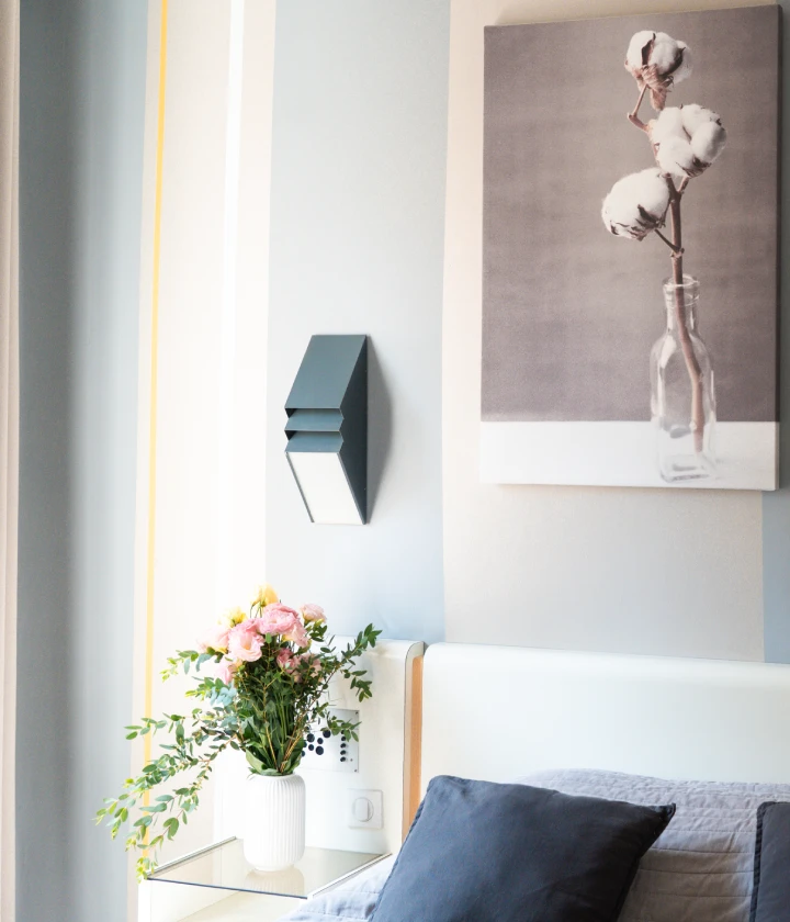 Chambre lumineuse avec lit, coussins bleus, tableau mural et vase de fleurs sur une table de chevet.