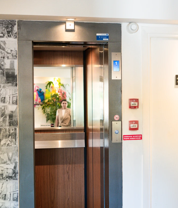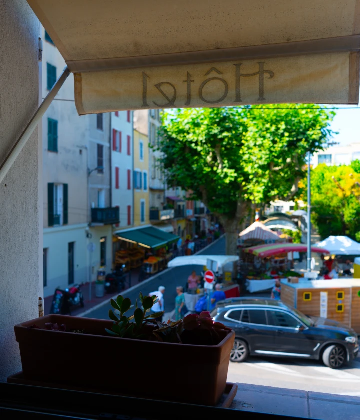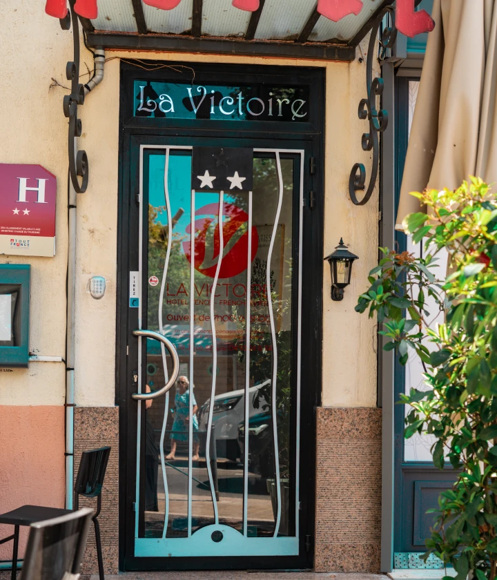Façade d'un hôtel et d'une crêperie, avec des plantes en premier plan.