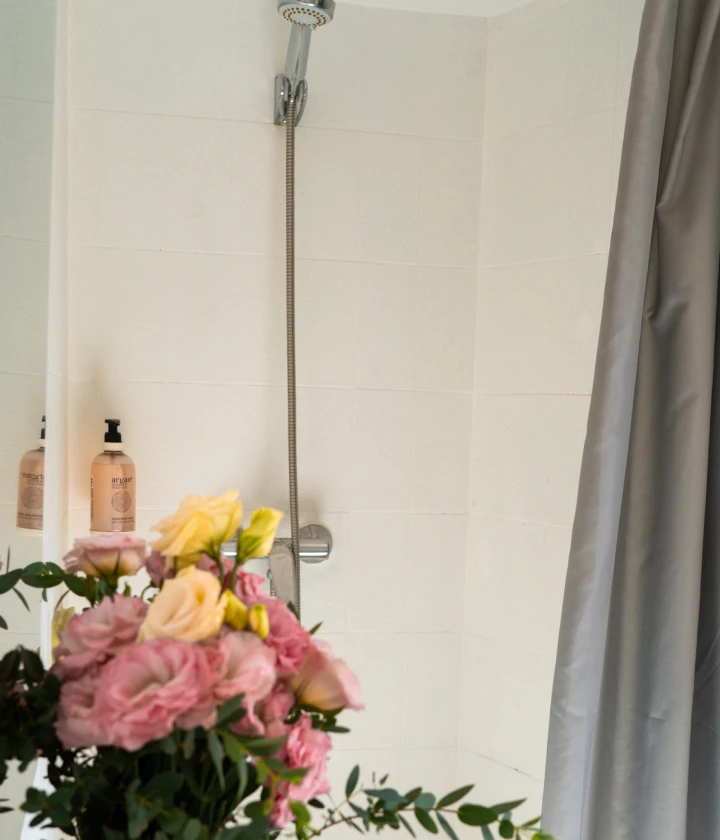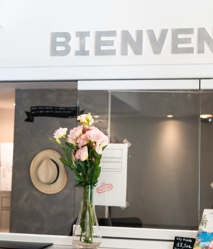 Vase de fleurs roses sur un comptoir, affiches et chapeau suspendu en arrière-plan.