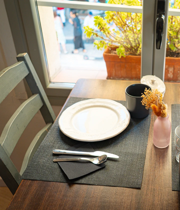 Salle à manger calme avec tables en bois, fleurs et lumière naturelle.