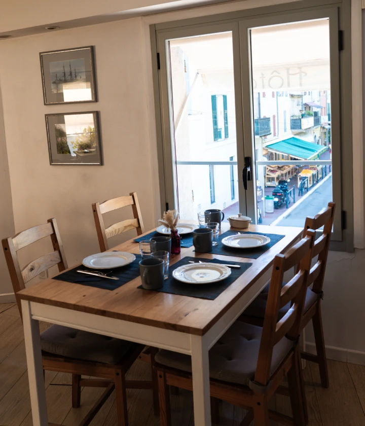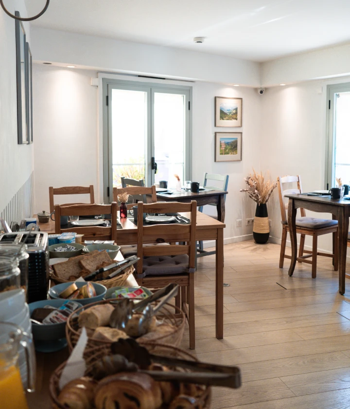 Salle à manger lumineuse avec tables en bois, fleurs, et tableaux sur le mur.