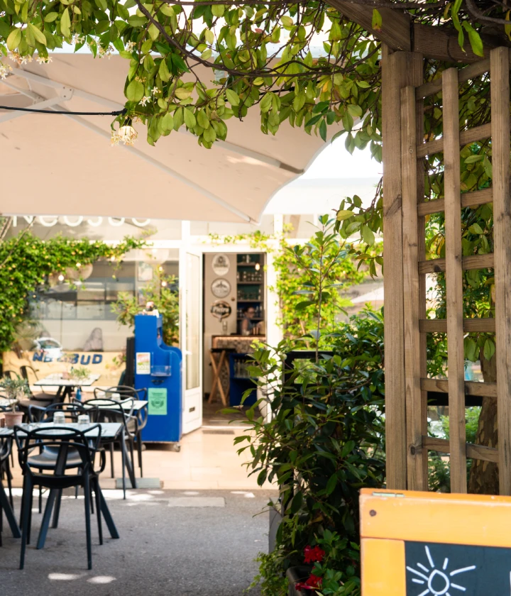 Terrasse de café avec chaises noires et table en marbre, entourée de plantes vertes.