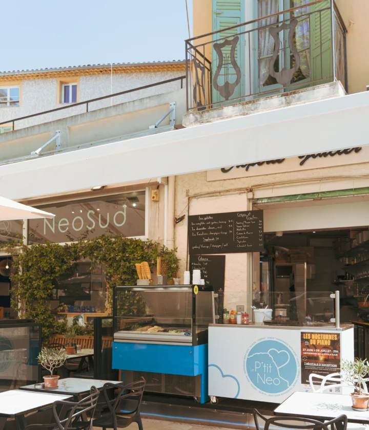 Ruelle ensoleillée avec un café-terrasse et des personnes marchant près d'un bâtiment ancien.